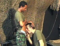 | Two foot soldiers are hanging out by their tent killing time when the black